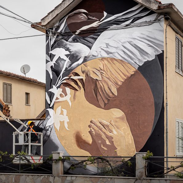Her mural reimagines the Venus de Milo, the pale, limbless bust rising from the wall. The head opens into a branch of jasmine. A swan rests above it.